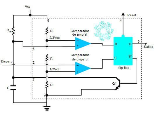 El tren de pulsos se activa cuando el capacitor llega a los 2/3 del VCC, es cuando el flip flop se restablece, activando el transistor en modo de descarga para la energía almacenada del capacitor de R2, con una constante de tiempo 0.693*R2*C, cuando el capacitor llega a 1/3 de su almacenamiento el ciclo se vuelve a reiniciar.