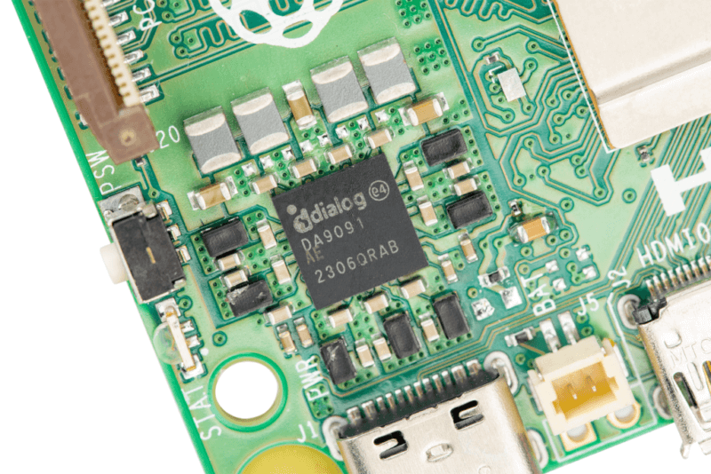 BCM2712 y RP1 son compatibles con el tercer componente nuevo del chipset, el IC de administración de energía (PMIC) “Gilmour” Renesas DA9091. Esto integra ocho fuentes de alimentación de modo conmutado separadas para generar los diversos voltajes requeridos por la placa, incluida una fuente de núcleo cuádruple, capaz de proporcionar 20 amperios de corriente para alimentar los núcleos Cortex-A76 y otra lógica digital en BCM2712.