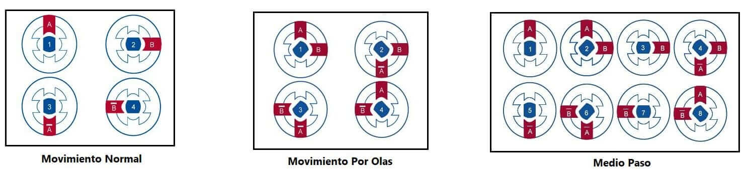 - Por olas: Consiste en excitar una bobina cada vez. El consumo se reduce al igual que el par, por lo tanto, es un consumo y par moderados.