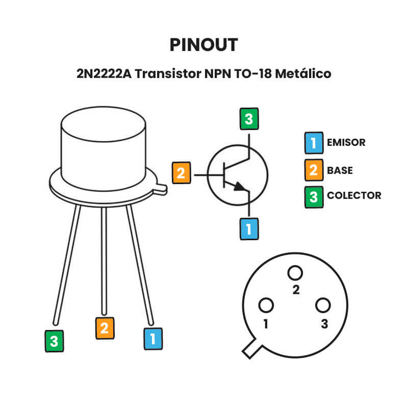 2N2222A es un transistor NPN de silicio diseñado para aplicaciones de conmutación. Este transistor tiene un encapsulado de metal TO-18 de 3 pines que son base, colector y emisor, donde el emisor se encarga de emitir o inyectar electrones, la base permite transferir o pasar los electrones y el colector se encarga de colectar electrones.