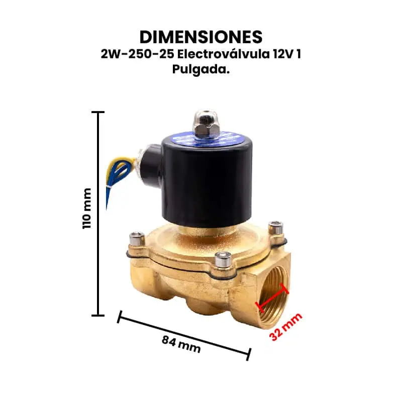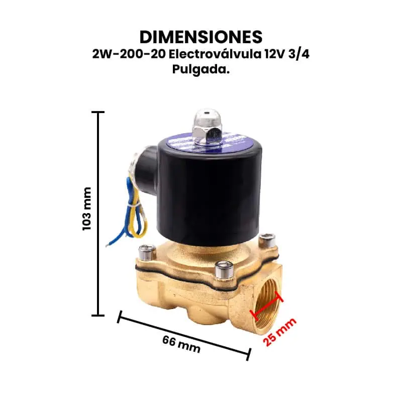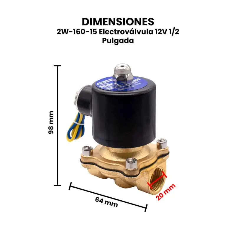 La 2W-160-15/20/25 es una electroválvula de uso común para controlar el paso de líquidos o gases en sistemas automatizados. Funciona con una alimentación de 12V DC y está disponible en distintos tamaños de rosca: 1/2 pulgada (modelo 2W-160-15), 3/4 pulgada (2W-160-20) y 1 pulgada (2W-160-25), lo que permite adaptarse a diferentes requerimientos de caudal. Esta electroválvula es del tipo normalmente cerrada (NC), es decir, permanece cerrada cuando no recibe energía, y se abre al aplicar voltaje. Su cuerpo suele estar fabricado de latón, lo que le brinda buena resistencia a la corrosión y durabilidad en entornos exigentes. Además, no debe operar sin fluido (en seco) por períodos prolongados, ya que esto puede causar sobrecalentamiento del solenoide. La válvula debe instalarse en una posición que permita el flujo en la dirección indicada por la flecha del cuerpo, y en ambientes que no excedan sus especificaciones de presión y temperatura.