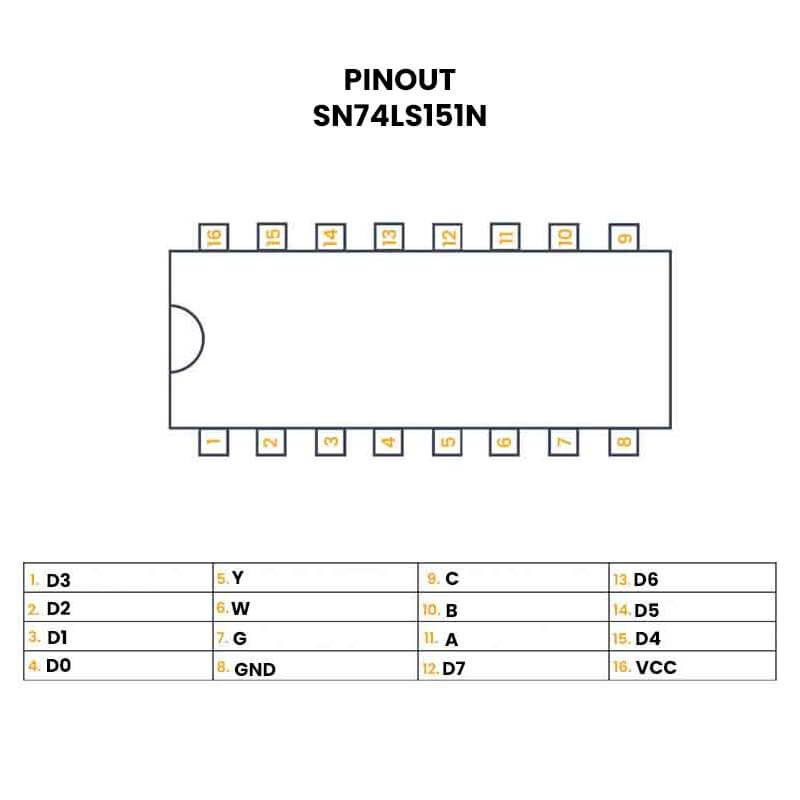El 74LS151 o SN74LS151N es un multiplexor de datos de 8 entradas con decodificación binaria completa en el chip para seleccionar la fuente de datos deseada. El LS151 selecciona una de las ocho fuentes de datos. Un nivel alto en la luz estroboscópica fuerza la salida W alta y la salida Y (según corresponda) baja. El LS151 cuenta con salidas W e Y complementarias. Para usar como generador de funciones booleanas.