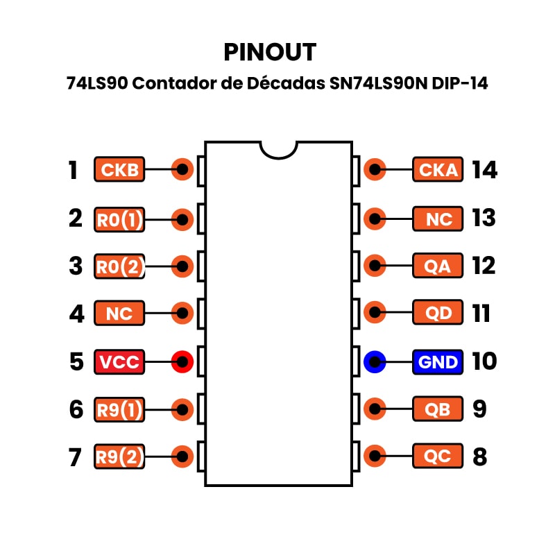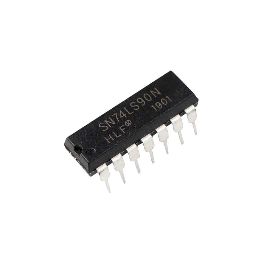 El 74LS90 es un circuito integrado tipo contador de décadas BCD (Binary-Coded Decimal), diseñado para contar pulsos eléctricos y representarlos en un formato binario del 0 al 9. Se basa en tecnología TTL (Transistor-Transistor Logic) y tiene encapsulado DIP-14 con 14 pines que incluyen entradas de reloj (Clock A y Clock B), entradas de reset (R0(1) y R0(2)), y salidas binarias (Q0, Q1, Q2 y Q3).