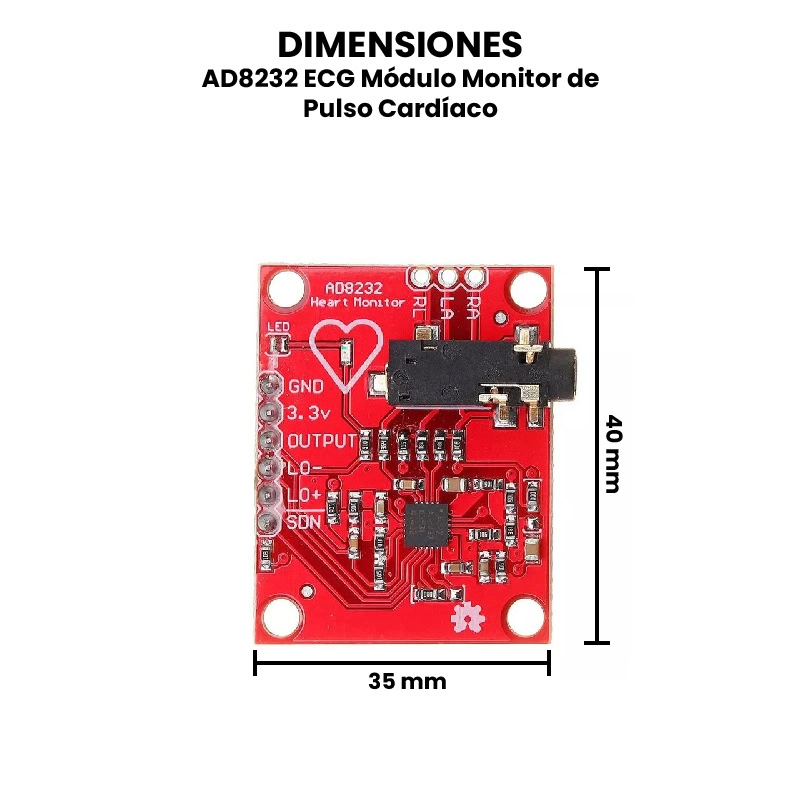 El AD8232 ECG Módulo Monitor de Pulso Cardíaco es un módulo electrónico diseñado para medir la actividad eléctrica del corazón, generando señales de electrocardiograma (ECG) de forma precisa y en tiempo real. Basado en el chip AD8232 de Analog Devices, este módulo actúa como un amplificador de señal biopotencial, ideal para aplicaciones médicas portátiles, monitoreo de salud, investigaciones biomédicas y proyectos de bioingeniería. Es capaz de detectar el ritmo cardíaco mediante electrodos conectados al cuerpo, y su diseño compacto permite integrarlo fácilmente en sistemas embebidos. El AD8232 proporciona nueve conexiones desde el circuito en el que puedes soldar pines, cables u otras conexiones.