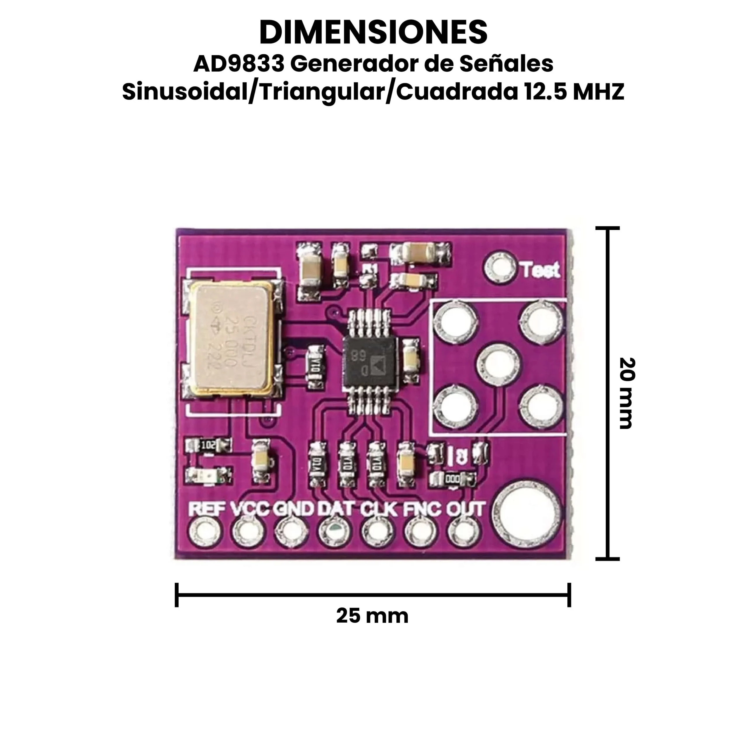 El AD9833 Generador de Señales Sinusoidal/Triangular/Cuadrada de 12.5 MHz es un módulo generador de funciones digitales basado en el circuito integrado AD9833, capaz de producir señales senoidales, triangulares y cuadradas con alta precisión y estabilidad, permitiendo generar frecuencias ajustables con gran exactitud hasta aproximadamente 12.5 MHz, ideal para pruebas electrónicas, proyectos educativos y aplicaciones de laboratorio.