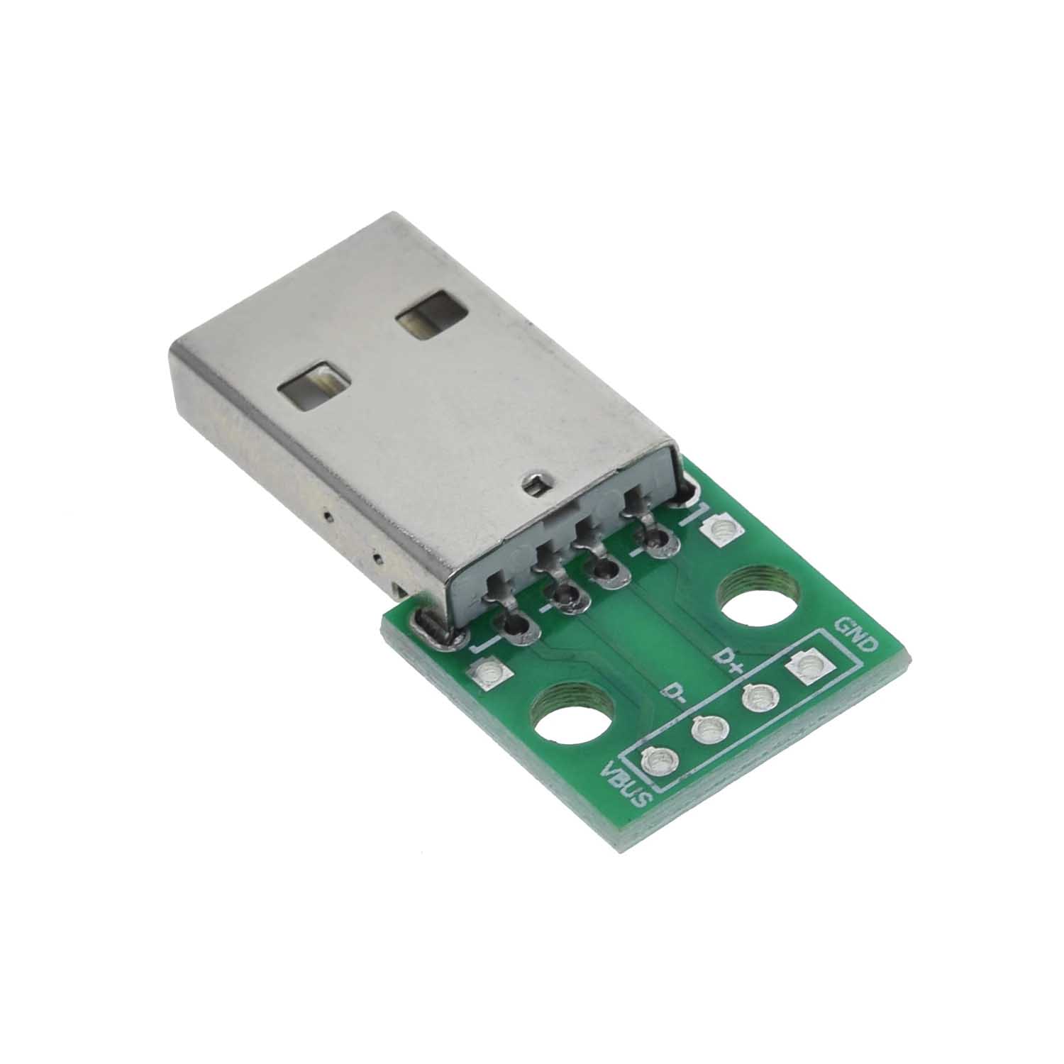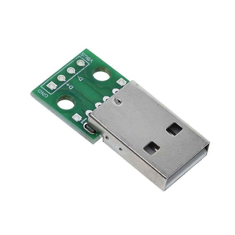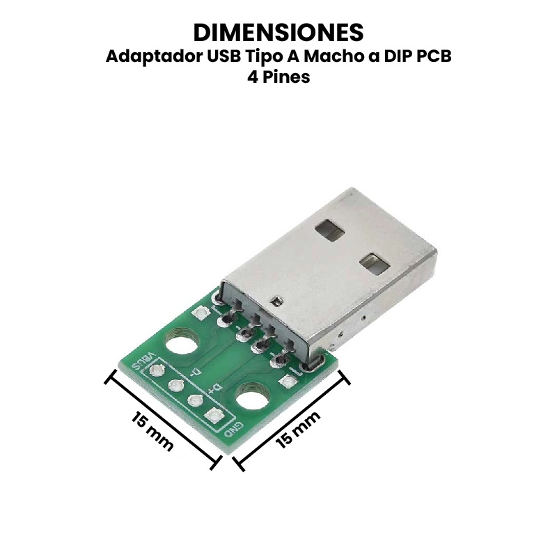 El Adaptador USB Tipo A Macho a DIP PCB de 4 pines es un pequeño módulo diseñado para facilitar la conexión de dispositivos USB a protoboards o placas de circuito impreso (PCB) mediante pines con formato DIP (Dual In-line Package). Este adaptador convierte el conector USB tipo A macho en una salida de 4 pines claramente etiquetados: VBUS, D-, D+ y GND, que corresponden a los pines estándar del protocolo USB 2.0. Su funcionamiento es pasivo, es decir, no contiene componentes electrónicos activos; simplemente enruta las señales del conector USB a los pines para que puedan ser utilizadas en proyectos de electrónica.