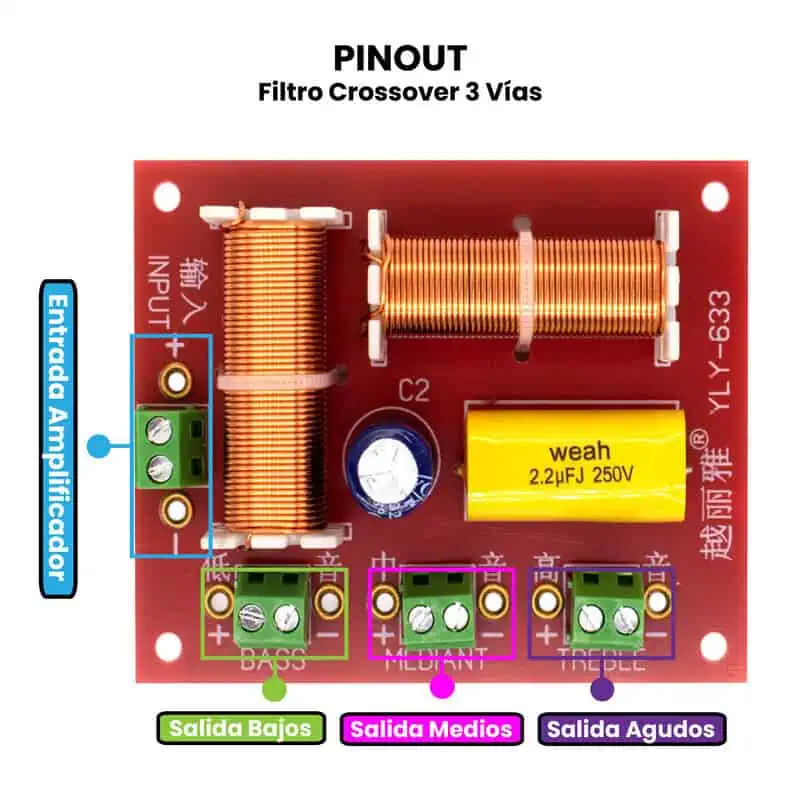 El Filtro Crossover de 3 y 2 vías es un circuito pasivo diseñado para dividir la señal de audio en diferentes rangos de frecuencia —bajas, medias y altas— y dirigir cada uno al altavoz correspondiente (woofer, midrange y tweeter). Su funcionamiento se basa en el uso de inductores, condensadores y, en algunos casos, resistencias, que actúan como filtros selectivos: los inductores dejan pasar las frecuencias bajas, los condensadores permiten el paso de las altas, y la combinación de ambos define las frecuencias medias. En un crossover de 2 vías, la señal se separa en graves y agudos, mientras que en uno de 3 vías, se añaden las frecuencias medias para una reproducción más equilibrada y fiel del sonido. Esto permite una mejor calidad de sonido al dirigir frecuencias específicas a altavoces con impedancias de entre 4 a 16 Ω.