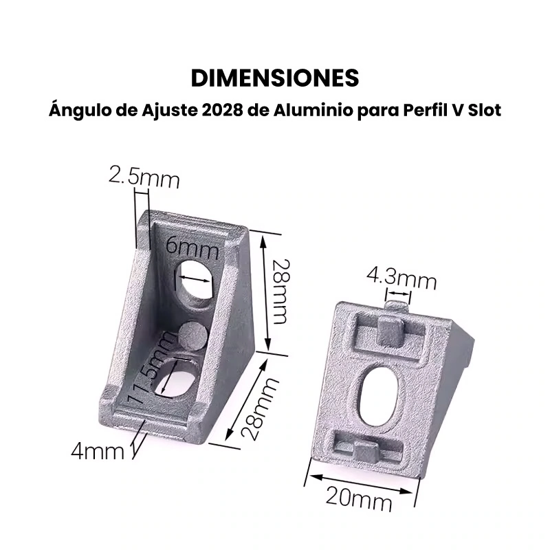 Los ángulos de ajuste para perfil V-Slot disponibles en dimensiones de 20×20 mm y 20×28 mm son piezas metálicas diseñadas para unir perfiles de aluminio en esquinas, generalmente en un ángulo de 90°. Son ideales para estructuras modulares como impresoras 3D, CNC y otros proyectos de automatización, ya que ofrecen una fijación firme, precisa y fácil de montar, permitiendo mantener la rigidez y estabilidad del ensamblaje.