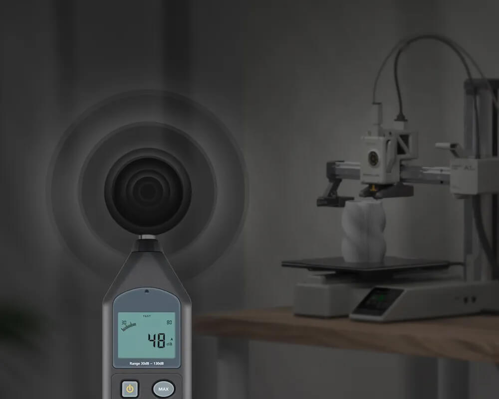 Cancelación activa de ruido del motorA1 mini es una de las impresoras 3D más silenciosas, con cancelación activa de ruido del motor y modo silencioso, reduciendo el ruido a menos de 48 dB.