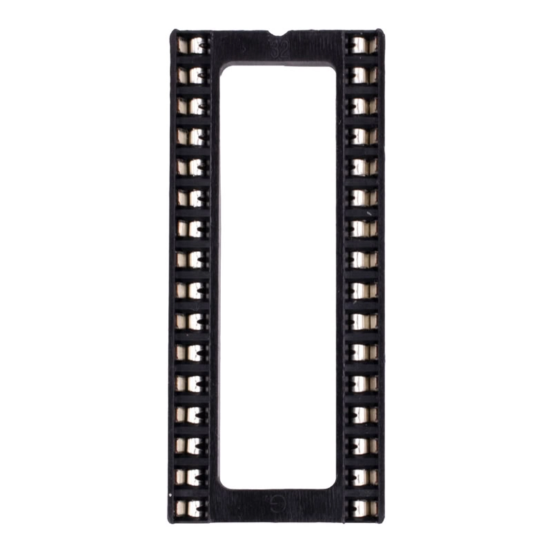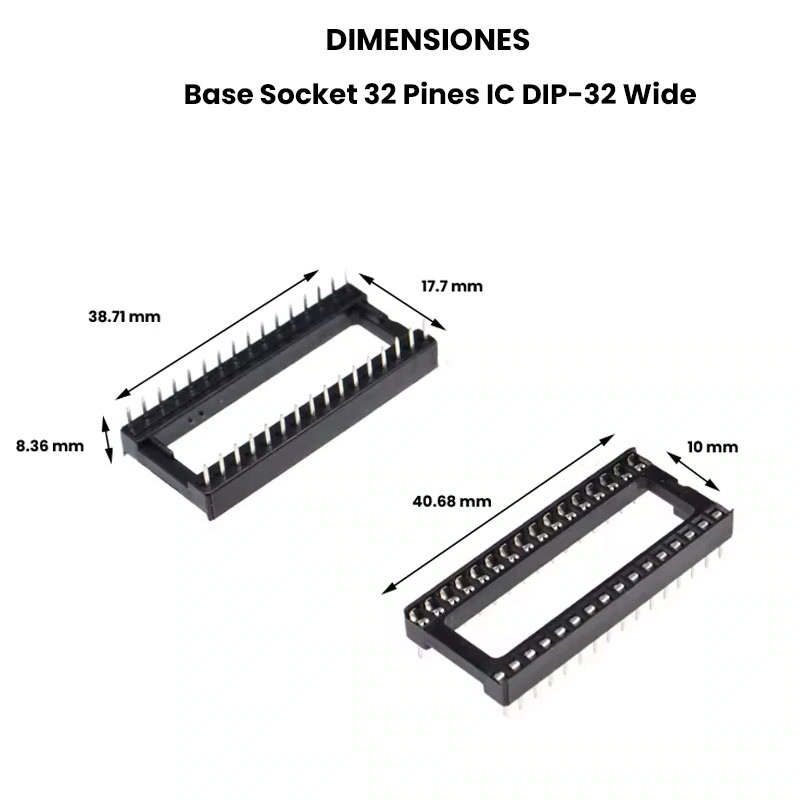 Base socket 28 pines, también conocido como zócalo o porta-integrados. El socket de 28 pines tiene tamaño ancho “Wide”, está diseñado para montar, fijar y desmontar fácilmente circuitos integrados “IC”, memorias o microcontroladores “MCU” de 28 pines con encapsulado DIP-28 sin necesidad de soldarlos directamente a placas PCB´s, evitar dañarlos así como asegurar la alimentación, transmitir y recibir las señales de los circuitos integrados.