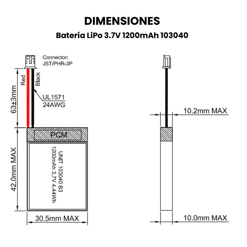 - Polaridad: La batería cuenta con un conector JST PHR-2 Pitch 2 mm, adaptable a diversos módulos, placas de expansión, etc.