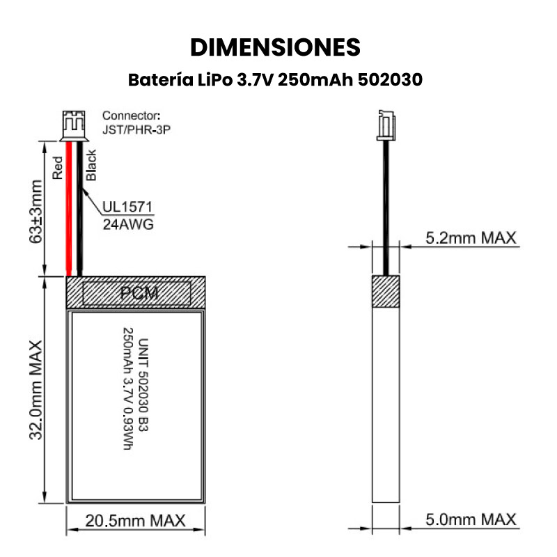 - Polaridad: La batería cuenta con un conector JST PHR-2 Pitch 2 mm, adaptable a diversos módulos, placas de expansión, etc.