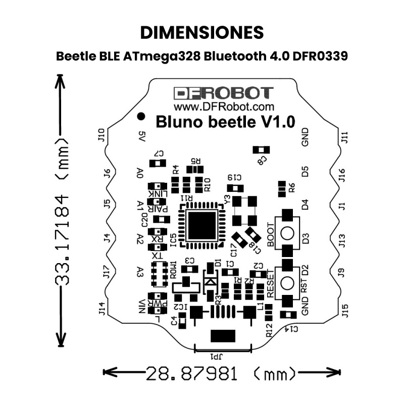 Es ideal para desarrollar prototipos de forma rápida y sencilla, ya que ofrece funcionalidades similares a las de un Arduino Uno, pero en un tamaño mucho más reducido y con conectividad Bluetooth integrada. Forma parte de la familia Beetle, diseñada para proyectos compactos como dispositivos portátiles, regalos interactivos, textiles electrónicos, talleres educativos y proyectos DIY. Perfecta para estudiantes, makers y desarrolladores que buscan una solución pequeña pero potente.