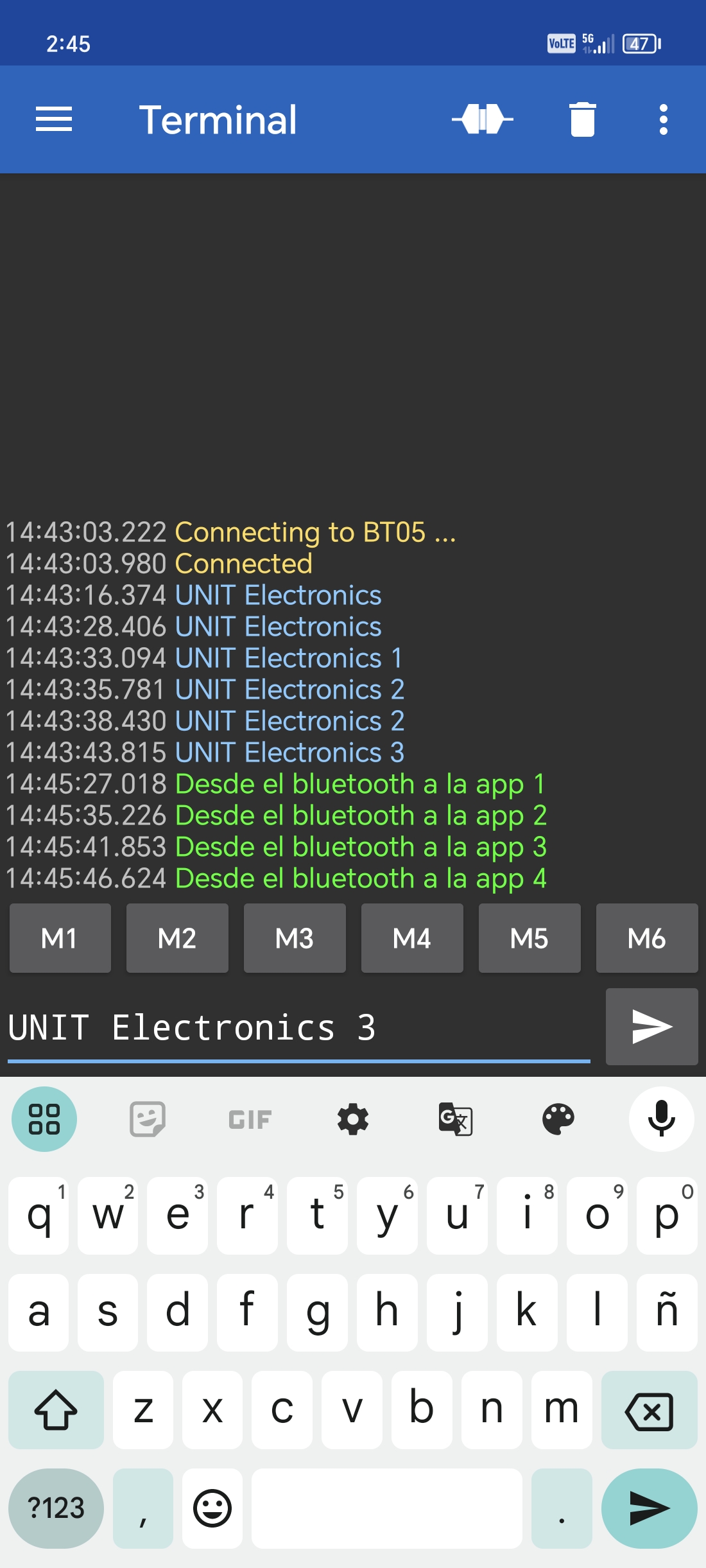 Escribe comandos en la aplicación terminal de Android y envíalos. Los mensajes enviados por la app al módulo bluetooth aparecerán de color azul.