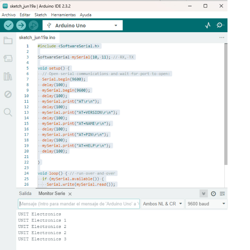 Utiliza el monitor serie de Arduino IDE para enviar comandos AT al módulo o utiliza el siguiente código en tu Arduino para conocer la configuración establecida en tu módulo, como la versión, el nombre, el pin o contraseña y los comando AT que reconoce el módulo.