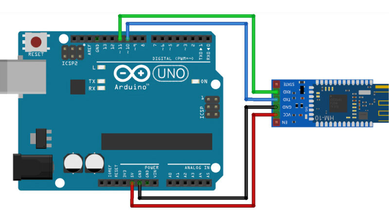 Nota: puedes apoyarte en la conexión y los comandos AT del módulo Bluetooth HM-10 con Arduino en UNIT Electronics: Bluetooth HM10 cargar comandos AT