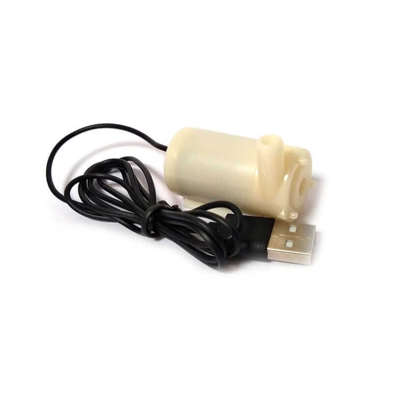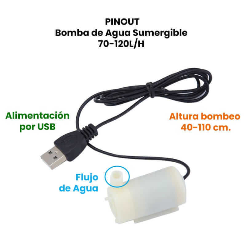 La Bomba de agua sumergible es un dispositivo electromecánico totalmente sumergible que te permitirá tener un flujo de hasta 2 L por minuto (de 70-120L/h) con un voltaje de funcionamiento de 2,5v a 6v DC por medio de USB. Incluye un motor interno de 800mA.