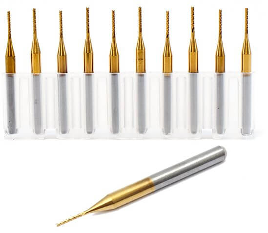 Brocas de Fresado para PCB y CNC son de acero de tungsteno y tienen recubrimiento de titanio. Disponible en juego de 10 brocas con diámetro de punta: 1.0mm, 2.0mm y 3.0mm