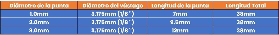 - Aplicaciones: PCB, herramientas para CNC, elaboración de moldes, plástico, fibra de carbono, madera dura (MDF / Contrachapada), PVC y acrílico.