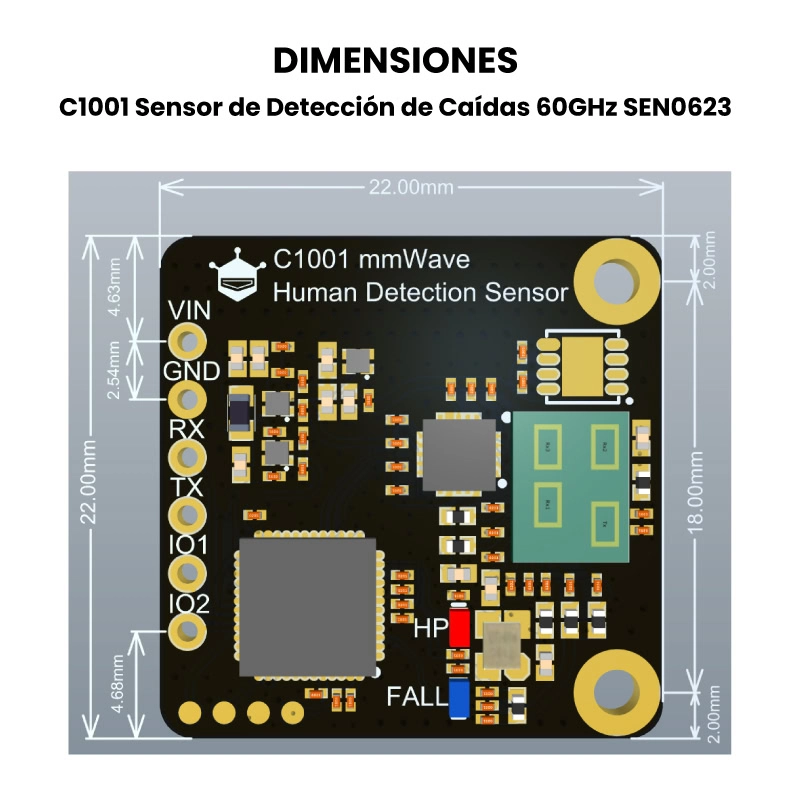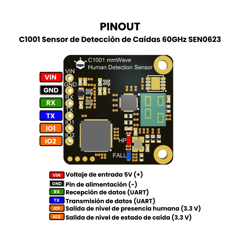 El C1001 sensor de detección de caídas, es un avanzado sensor de radar de ondas milimétricas de 60GHz, diseñado para detección humana únicamente para detectar caídas y monitorización del sueño. Su capacidad para reconocer posturas humanas mediante un algoritmo de imágenes de nube de puntos permite detectar si una persona está acostada o sufrió una caída. Este sensor puede detectar movimiento o incluso cuando una persona permanece estática.