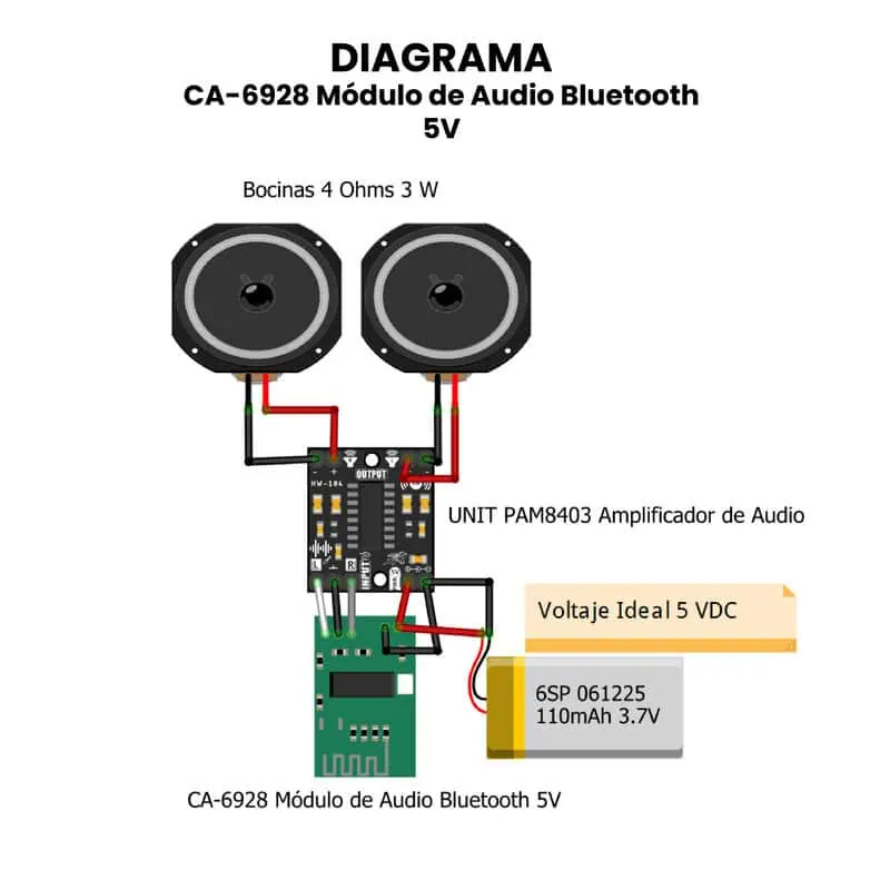 El CA-6928 Módulo de Audio Bluetooth 5V se utiliza ampliamente en proyectos de audio inalámbrico, permitiendo añadir conectividad Bluetooth a equipos que originalmente no la poseen. Sus principales aplicaciones incluyen reproductores de audio caseros, bocinas portátiles, amplificadores, radios y sistemas de sonido para automóviles o motocicletas. Su fácil conexión y bajo consumo de energía lo hacen ideal para modernizar sistemas de audio tradicionales o desarrollar prototipos de dispositivos Bluetooth personalizados.