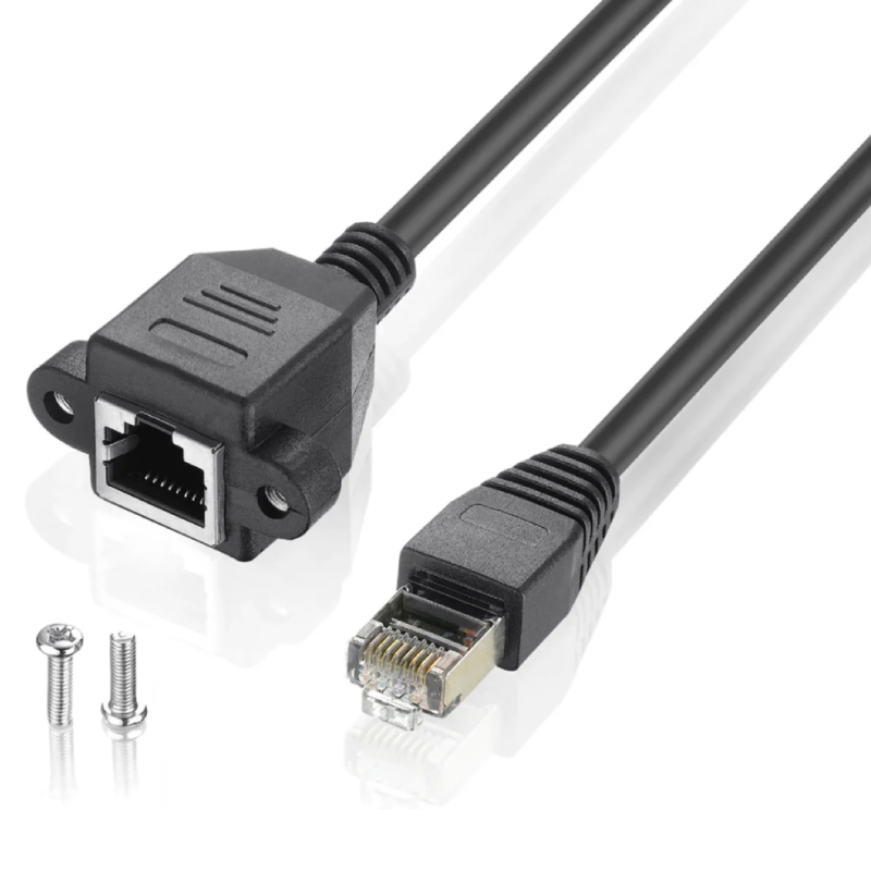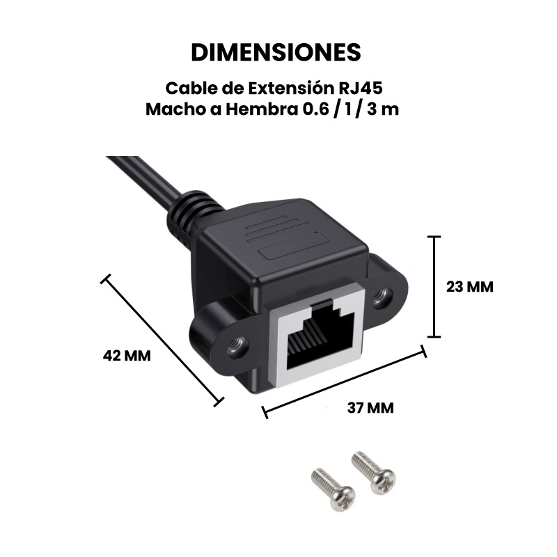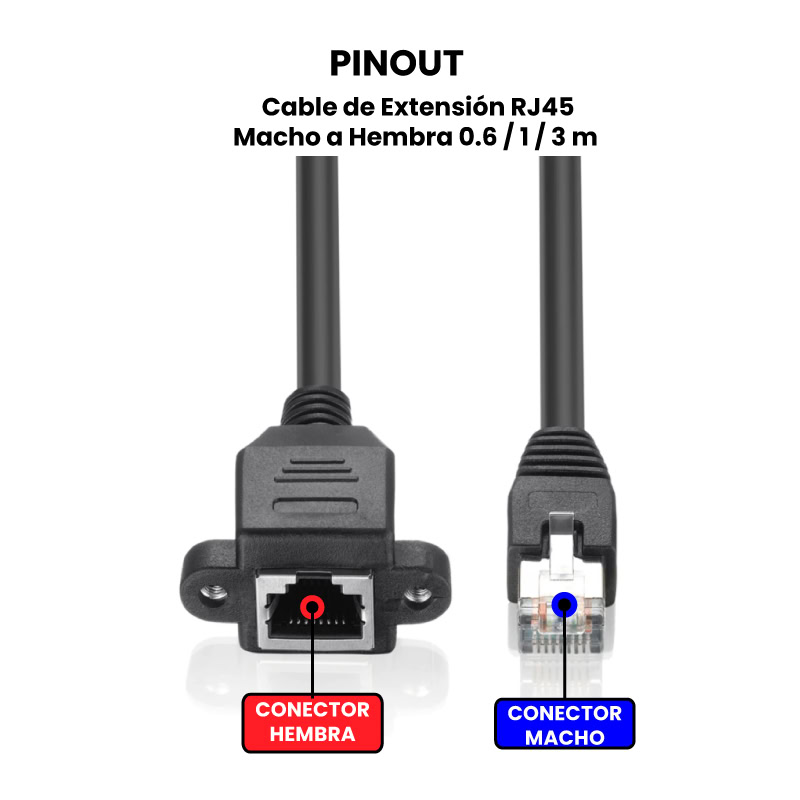 El Cable de Extensión RJ45 Macho a Hembra esta diseñado para extender la longitud de una conexión de red existente. Disponible en diferentes longitudes: 60 cm, 1 y 3 metros. Está equipado con conectores RJ45 macho en un extremo y RJ45 hembra en el otro, permitiendo la conexión de dispositivos adicionales sin necesidad de modificar la instalación original. Las “orejas” del cable, ubicadas en el extremo hembra, son pequeñas extensiones planas con orificios para tornillos (incluidos), permitiendo su fijación a superficies como paneles, paredes o racks de servidores.