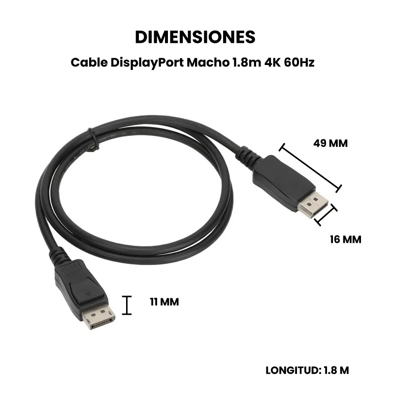 El cable DisplayPort macho 1.8m 4K 60Hz está diseñado para transmitir señales de audio y video de alta calidad entre dispositivos compatibles. Este tipo de cable se caracteriza por su conector DisplayPort en ambos extremos, el cual es estándar en muchos monitores, tarjetas gráficas, y computadoras modernas.