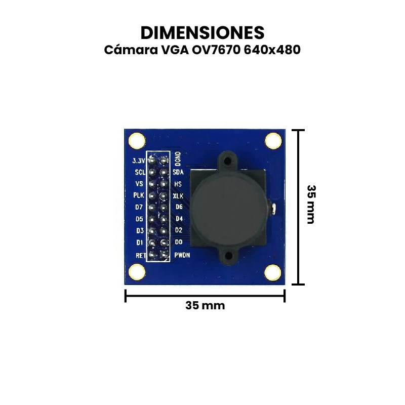 La Cámara VGA OV7670 640×480 es un módulo de captura de imágenes de bajo costo y tamaño compacto, ampliamente utilizado en proyectos de electrónica y sistemas embebidos para obtener fotografías o video en resolución VGA (640×480 píxeles). Funciona mediante un sensor CMOS que convierte la luz captada a través de su lente en señales eléctricas, las cuales son procesadas internamente para generar una salida digital compatible con microcontroladores. El módulo transmite la información de imagen a través de una interfaz SCCB (Serial Camera Control Bus) o pines paralelos, permitiendo ajustar parámetros como brillo, contraste y balance de blancos.