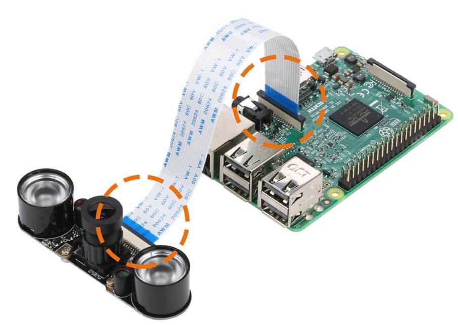 La cámara es fácil de utilizar, primero deberás armar los sensores infrarrojos a la cámara con la ayuda de los tornillos y tuercas después conecta el cable FFC de 15 pines a la cámara y después a la Raspberry Pi, en la siguiente imagen se muestra la conexión: