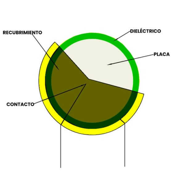 Este tipo de dispositivos almacenan voltaje y a esta capacidad se le llama capacitancia. Esta formado por dos conductores de signo opuesto pero que poseen cargas iguales, y la separación entre ellos es un material llamado dieléctrico.