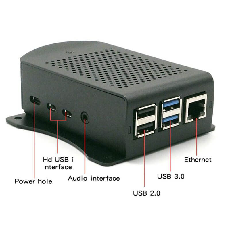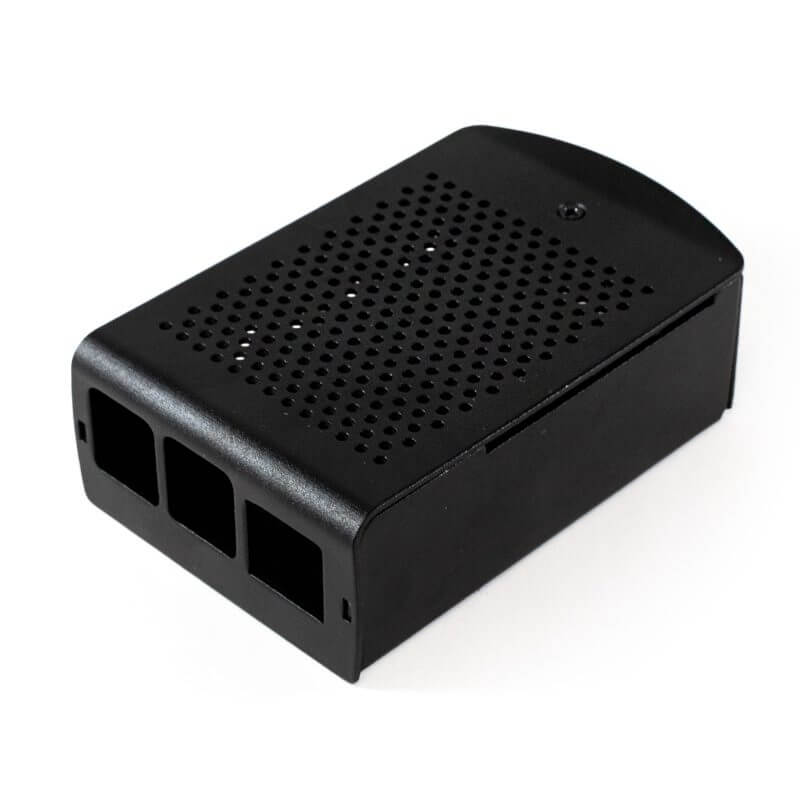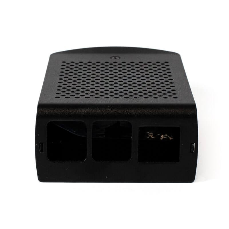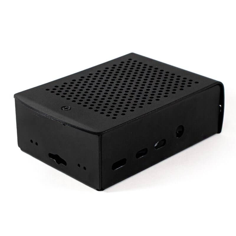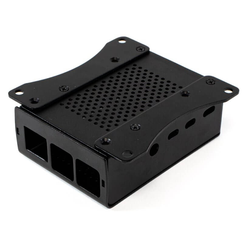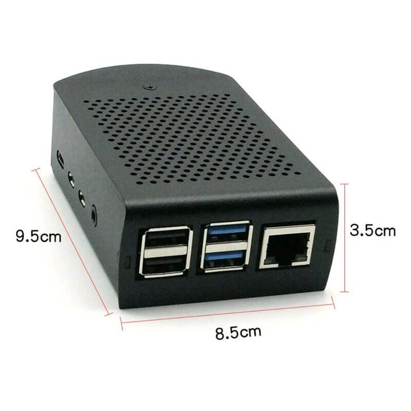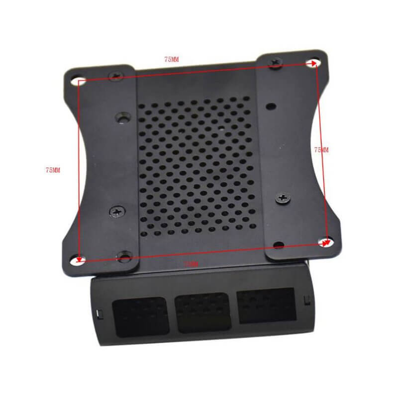 La Carcasa de Aluminio con Ventilador para Raspberry Pi 4B compacta y resistente de color negro. Esta carcasa incluye un ventilador con disipador de calor, 10 tornillos de fijación, 3 disipadores y dos soportes que te ayudaran a fijar la carcasa a cualquier superficie plana ya que incorpora 2 barrenos con diámetro de 4.45mm en cada soporte con separación entre cada barreno de 75mm.