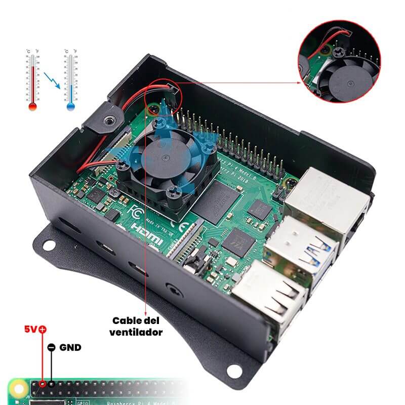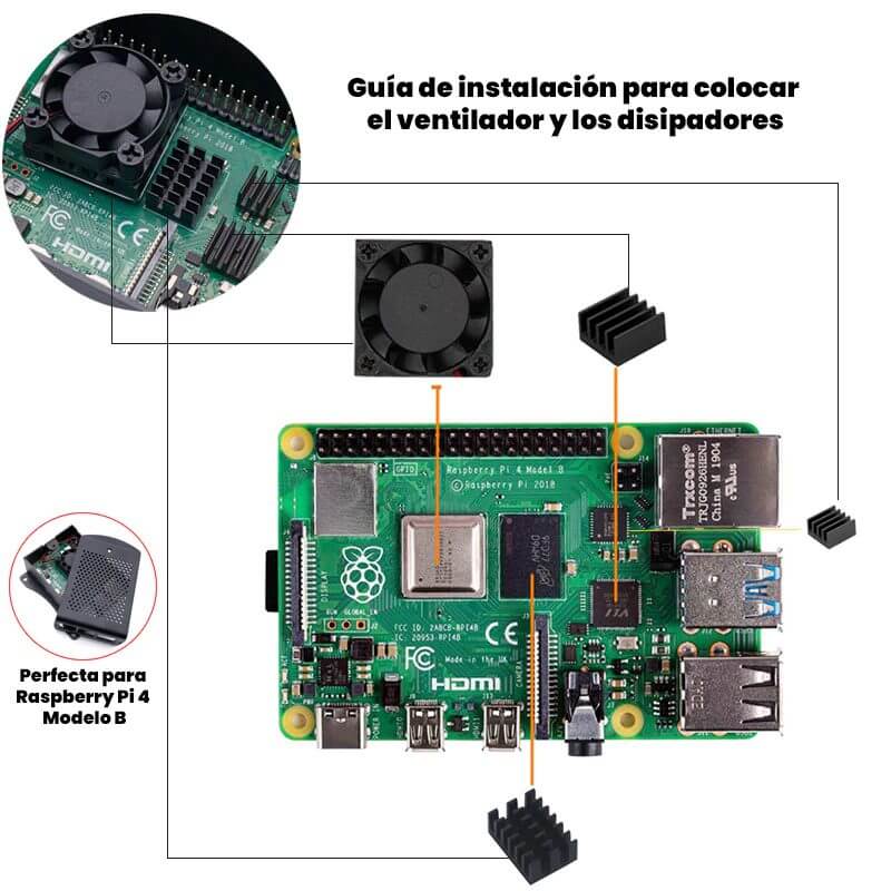 La Carcasa de Aluminio con Ventilador para Raspberry Pi 4B es ideal para proteger de daños, polvo y golpes, compatible con todas las versiones de memoria RAM ya sea 2g, 4g y 8g. La carcasa cuenta con perforaciones que ayudan a interconectar todos los puertos e interfaces de la Raspberry Pi 4B de igual manera incorpora agujeros en la parte inferior y superior que permiten tener ventilación.