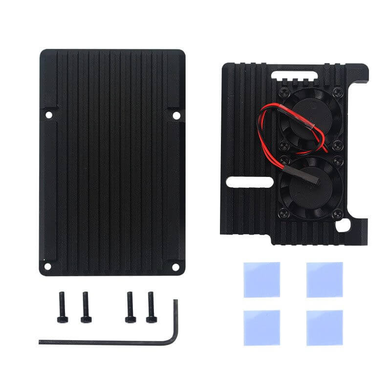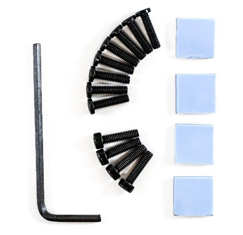 La carcasa cuenta con 2 ventiladores, 4 pads térmicos, 12 tornillos de fijación y llave Allen de 2 mm para armar la carcasa y fijar los ventiladores con la ayuda de los tornillos.