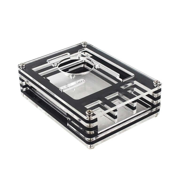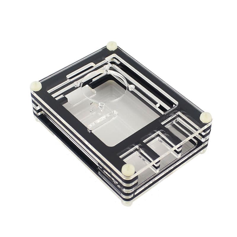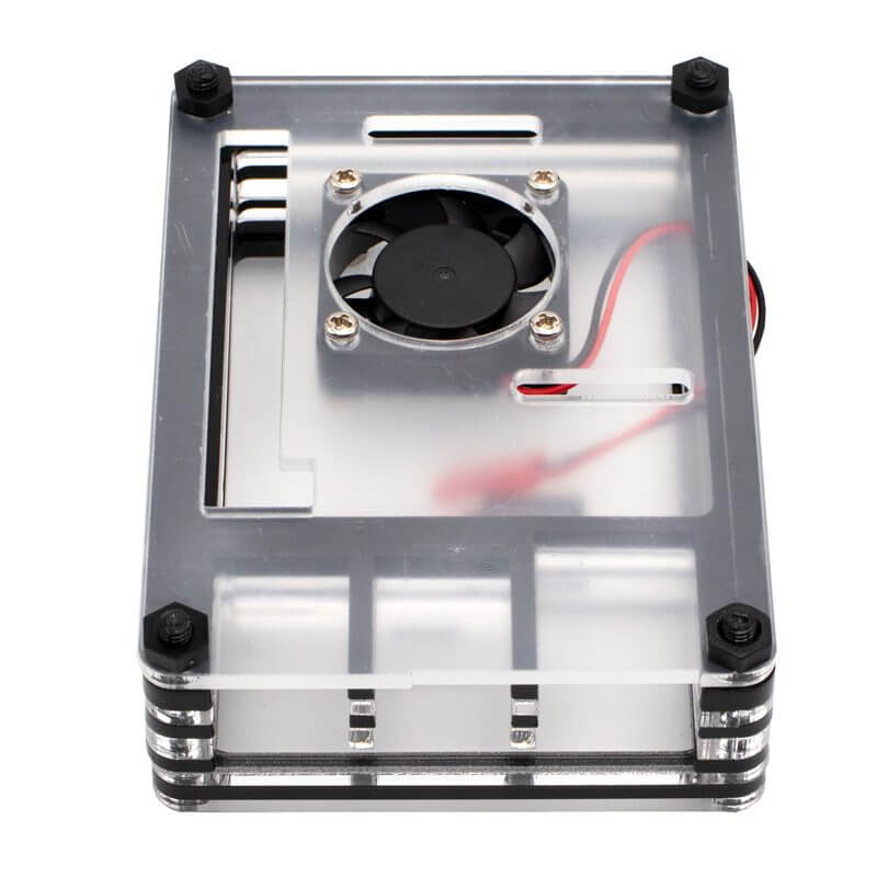 La Carcasa Raspberry Pi 4B Acrílico viene formado por 9 capas de acrílico, entre ellas son 5 transparentes y 4 negras y se sujetan entre sí por medio de tornillos, además de que esta carcasa cuenta con opción de montar un ventilador, el cual ya viene incluido con la carcasa.