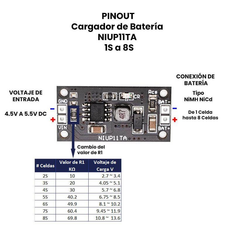 NIUP11TA es un módulo para cargar baterías de tipo níquel cadmio “NiCd” y hidruro de metal de níquel “NiMH”, recargables, el módulo por default esta configurado para cargar una batería de celda 1S de 1.2V, pero es configurable para poder cargar hasta 8S. Su voltaje de entrada va desde los 4.5V a 5.5V y con corriente de carga de 210mA a 240mA.