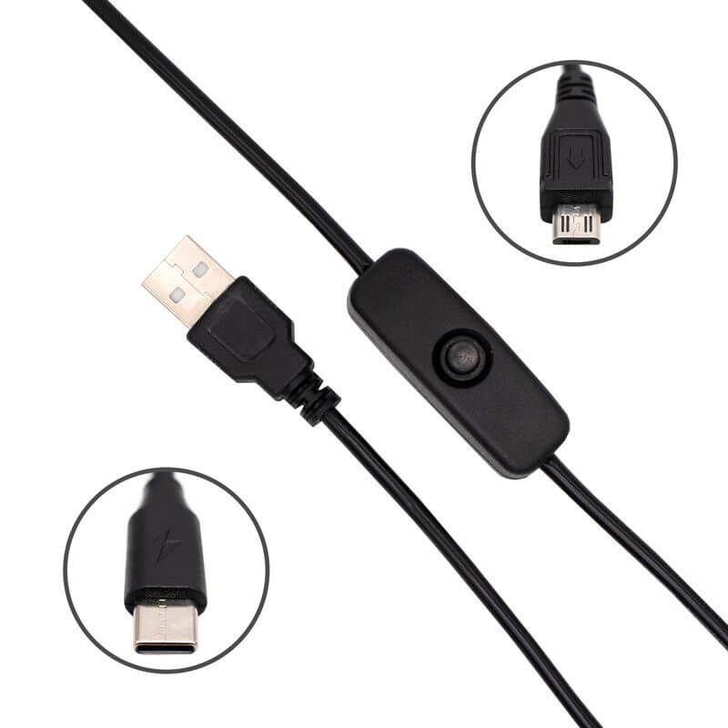 Cable Micro USB y Tipo C con Interruptor ON / OFF, se venden por separado. Estos cables sirven para suministrar voltaje de alimentación con la ayuda de un eliminador a cualquier tarjeta de desarrollo que incorpore puerto Micro USB o tipo C hembra, son utilizados con la familia de mini computadoras Raspberry Pi o Orange Pi para poder apagar y encender sin la necesidad de desconectar algún extremo del cable o incluso el mismo eliminador, debido a que posee un switch que permite activar o desactivar la alimentación.