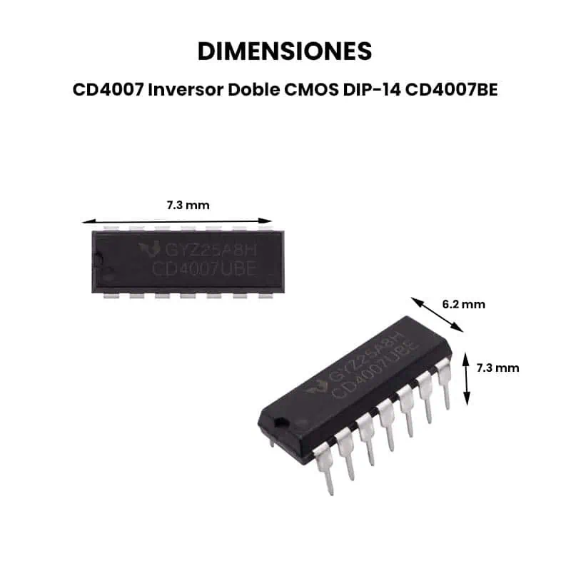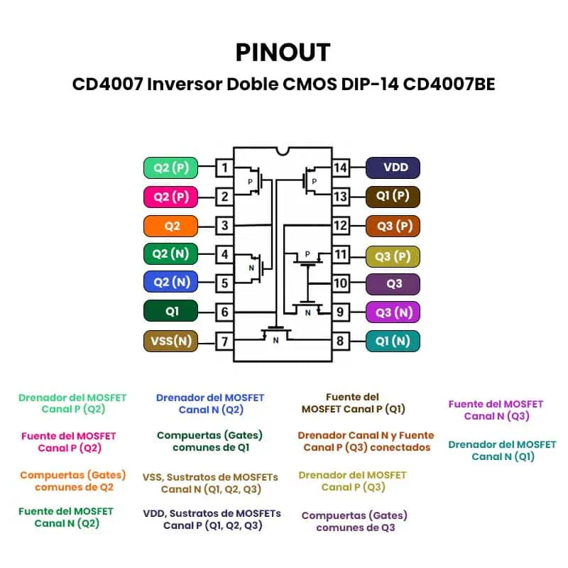 El CD4007BE es un circuito integrado de la familia CMOS que consta de tres pares complementarios de transistores MOSFET (canal N y P) de modo de enriquecimiento. Estos transistores son accesibles de forma independiente a través de los terminales del paquete, lo que permite una gran versatilidad para construir circuitos lógicos personalizados, amplificadores lineales y osciladores.