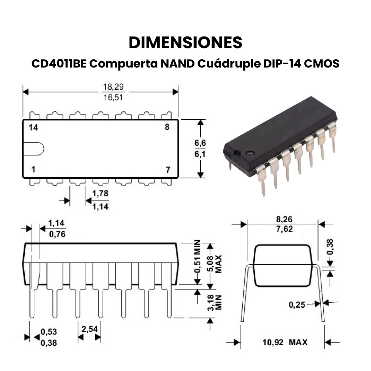 CD4011BE Compuerta NAND es un circuito integrado con encapsulado DIP-14, cuenta con 4 compuertas NAND de 2 entradas. La CD4011BE Compuerta NAND es un circuito lógico digital que implementa la conjunción de lógica negada, se comporta de acuerdo a su tabla de verdad al igual que su estructura y distribución de pines de conexión. Cuando todas sus entradas están en 1 (uno), su salida es 0 (cero), mientras que cuando una sola de sus entradas o ambas están en 0 (cero), su salida va a ser 1 (uno).