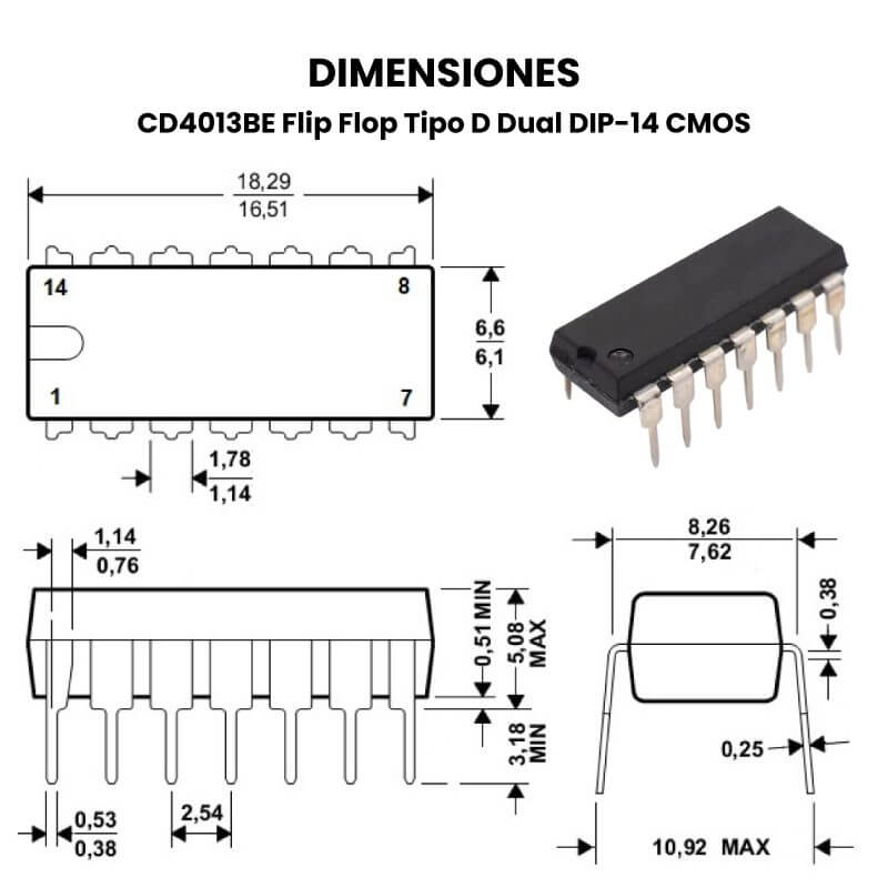 CD4013BE Flip Flop tipo D es un circuito integrado CMOS con encapsulado DIP-14 que se compone por 2 Flip Flop independientes, cada uno cuenta con entradas de datos, configuración, reinicio y reloj, así como salidas Q y Q\. Estos dispositivos se pueden utilizar en aplicaciones de registro de desplazamiento y aplicaciones de conteo y conmutación (conectando la salida Q\ a la entrada de datos). El nivel lógico presente en la entrada D se transfiere a la salida Q durante la transición positiva del impulso de reloj. La configuración y el reinicio son independientes del reloj y se realizan mediante un nivel elevado en la línea de ajuste o reinicio, respectivamente.