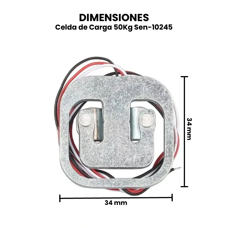 La Celda de Carga 50Kg SEN-10245 es un sensor de tipo resistivo diseñado para medir fuerzas o pesos aplicados, con una capacidad máxima de hasta 50 kilogramos. Este dispositivo funciona mediante el principio de galgas extensométricas (strain gauges) adheridas a una estructura metálica interna que se deforma ligeramente cuando se le aplica una carga. Dicha deformación cambia la resistencia eléctrica de las galgas, generando una señal eléctrica de muy bajo voltaje que es proporcional al peso aplicado. Esta señal se encuentra normalmente en el rango de milivoltios, por lo que requiere ser amplificada mediante un módulo como el Módulo HX711.