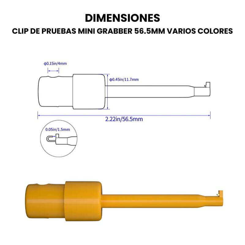 Clip de Pruebas Mini Grabber es un pequeño conector de 56.5mm de largo, el cual contiene un pequeño gancho en la punta que se puede conectar a cables o terminales de componentes o circuitos donde se requiera hacer una medición, suministrar alguna señal o voltaje.