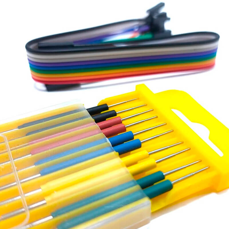 El Clip Pin Universal de IC es una herramienta utilizada en electrónica para facilitar la conexión y pruebas de circuitos integrados, el producto incluye 10 clips en una caja ,10 cables Dupont hembra- hembra y un manual de instrucciones. El Clip Pin Universal de IC generalmente tiene resortes que sostienen firmemente los pines del IC, estableciendo una conexión eléctrica confiable para pruebas, programación o depuración sin dañar los componentes.
