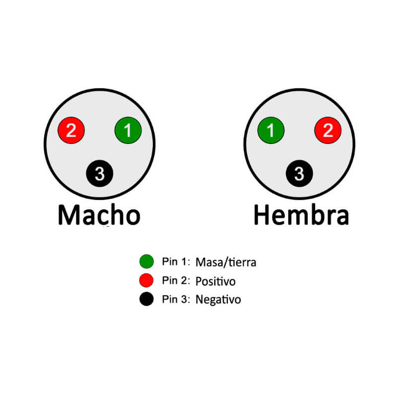 El Conector XLR Hembra y Macho es un tipo de conector circular de tres contactos o pines con capacidad de bloqueo que se emplea principalmente para la conexión de micrófonos, video, amplificadores e iluminación. Son conectores balanceados, lo que significa que utilizan dos hilos para transmitir la señal y un tercer hilo para masa, esto ayuda a reducir el ruido y la interferencia en la señal.