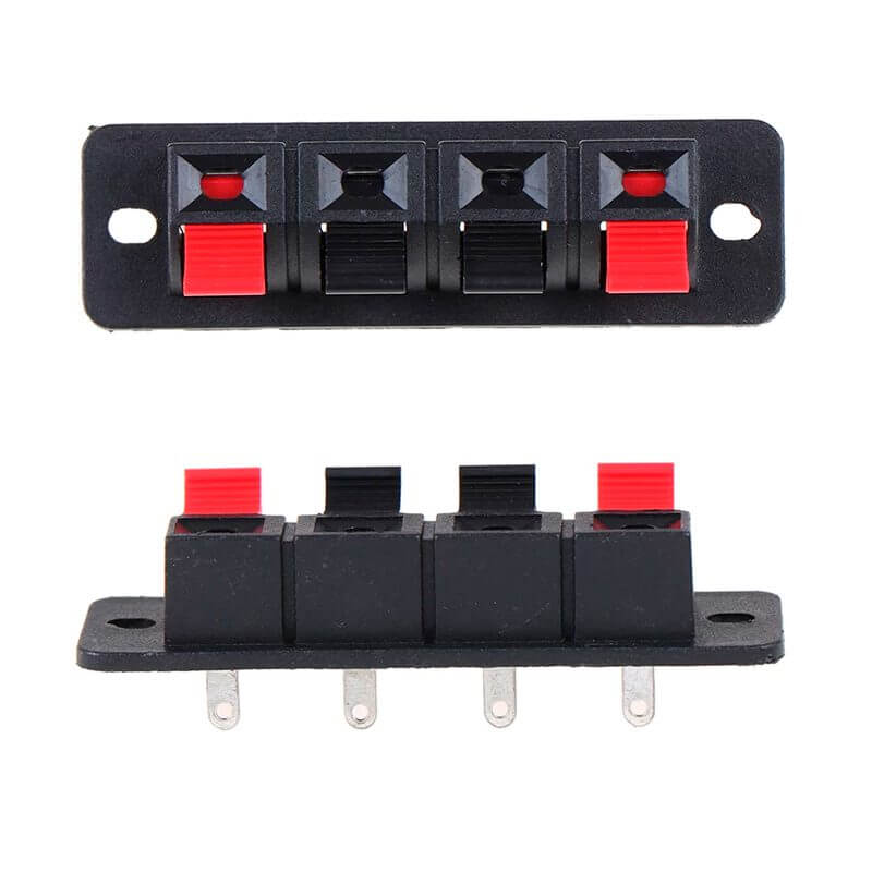 La versión de 4 vías posee 2 barrenos para fijar el conector a un gabinete, ambos modelos tienen una terminal por cada vía para soldar los cables internos del circuito, pueden soportar 50V y 3A de corriente alterna y sujetar cables desde calibre 24 a 16.