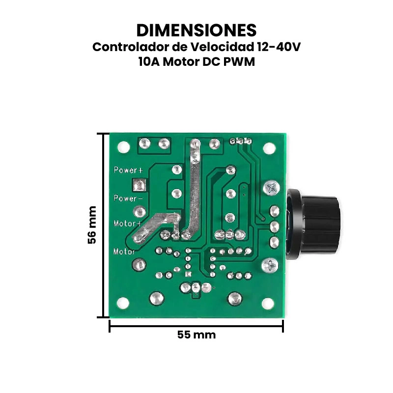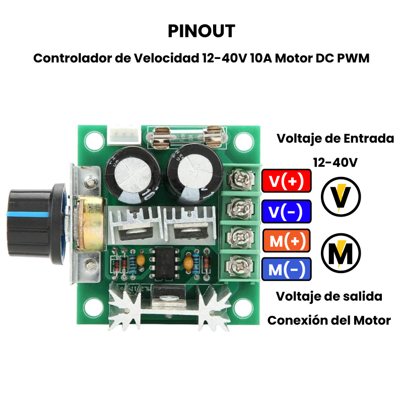 El Controlador de Velocidad PWM para Motor DC de 12-40V y 10A es un dispositivo electrónico diseñado para regular la velocidad de motores que funcionan con corriente continua (DC), utilizando la técnica de Modulación por Ancho de Pulso (PWM). Este controlador permite ajustar la velocidad de giro del motor en un rango de voltaje entre 12 y 40 voltios, con una corriente máxima de hasta 10 amperios.