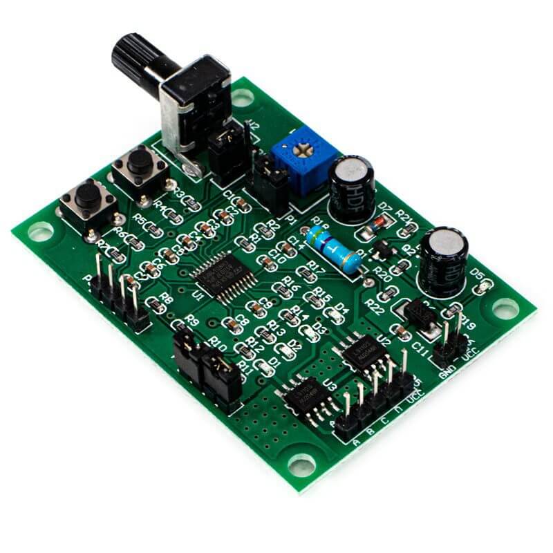 Es un módulo multifuncional para tener control de un solo motor paso a paso ya sea 2 Fases (Tiene 4 cables) y 4 Fases (Tiene 5 cables). Puede ser configurado en 4 modos de operación mediante 2 Jumper Select. Tiene 2 botones de control, incorpora 2 potenciómetros uno para ajustar la velocidad y el otro para definir los pasos. Además tiene entrada para 2 finales de carrera.