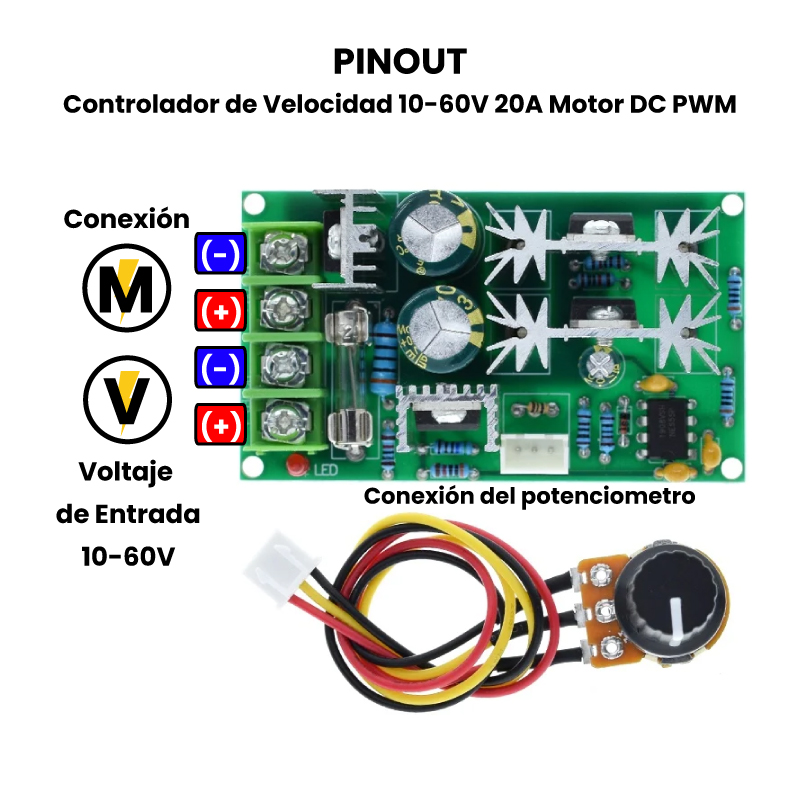 El controlador de velocidad 10–60V 20A para motor DC PWM es un dispositivo electrónico diseñado para regular la velocidad de motores de corriente directa (DC) mediante la técnica de modulación por ancho de pulso (PWM). Este método funciona variando el ciclo de trabajo (duty cycle) de una señal de conmutación de alta frecuencia, lo que permite controlar cuánta energía se entrega al motor sin pérdidas significativas de potencia ni generación excesiva de calor. Al modificar la duración de los pulsos, se logra un ajuste preciso de la velocidad del motor sin afectar su torque. Este controlador es capaz de manejar motores que operan entre 10 y 60 voltios, con una corriente máxima de 20 amperios, incorpora un potenciómetro para el ajuste manual de la velocidad y puede incluir protecciones contra sobrecorriente y sobrecalentamiento, garantizando un funcionamiento seguro y eficiente.