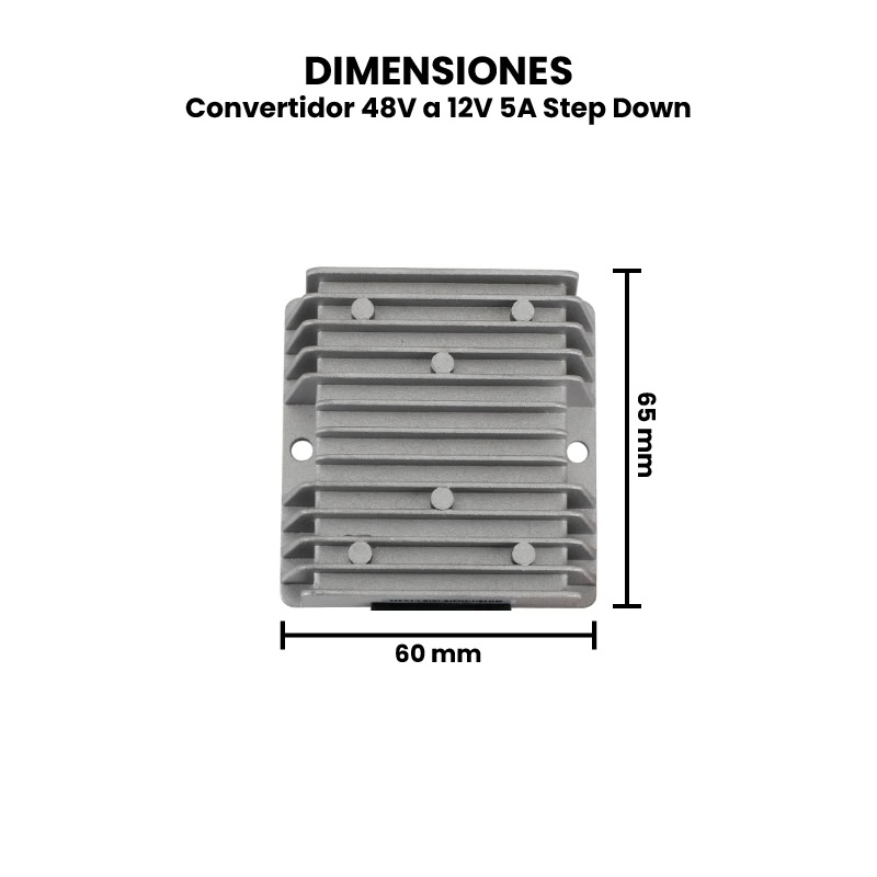 El dispositivo mostrado en la imagen es un convertidor DC-DC step-down de alta potencia, encapsulado en una carcasa de aluminio con aletas de disipación térmica, diseñado para reducir voltajes de entrada elevados (48 V) a una salida estable de 12 V 5 A. Internamente, utiliza tecnología de conmutación por modulación de ancho de pulso (PWM) para convertir eficientemente la energía, reduciendo el calor y mejorando la eficiencia en comparación con los reguladores lineales. Su diseño robusto y sellado lo hace ideal para aplicaciones exigentes, ya que disipa el calor de manera pasiva mediante su disipador integrado, permitiendo manejar corrientes altas con seguridad y estabilidad.