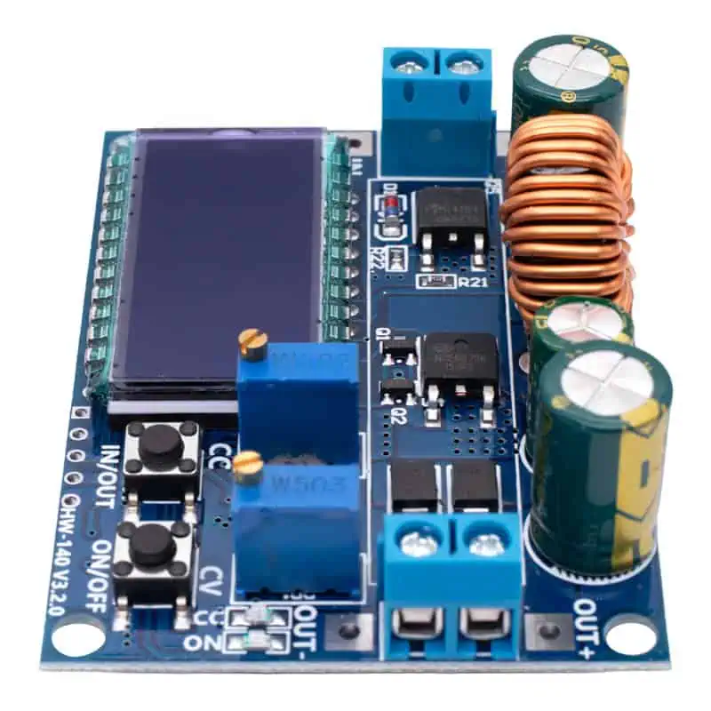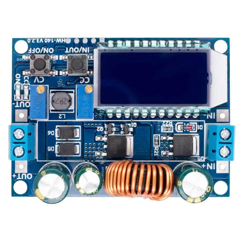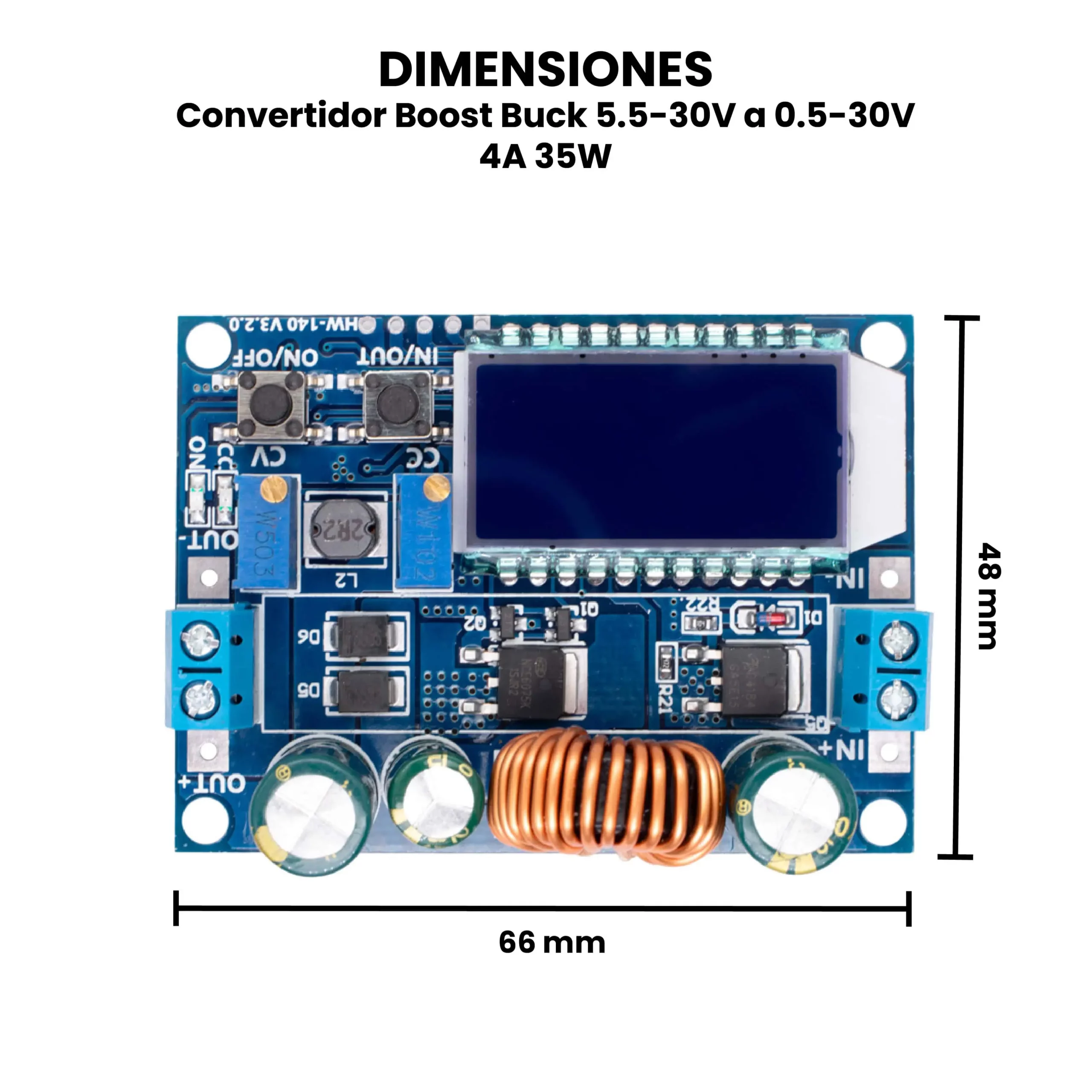 El Convertidor Boost Buck 5.5-30V a 0.5-30V 4A 35W es un módulo electrónico diseñado para regular y estabilizar el voltaje de corriente continua, permitiendo tanto elevar (boost) como reducir (buck) el voltaje de entrada según las necesidades del dispositivo conectado. Su funcionamiento se basa en un circuito de conmutación eficiente que ajusta automáticamente la tensión de salida manteniéndola estable, independientemente de las variaciones de la fuente de entrada. Gracias a su pantalla integrada, el usuario puede monitorizar en tiempo real el voltaje y la corriente de salida, incluye 4 sujetadores de plástico para montaje y un disipador térmico.