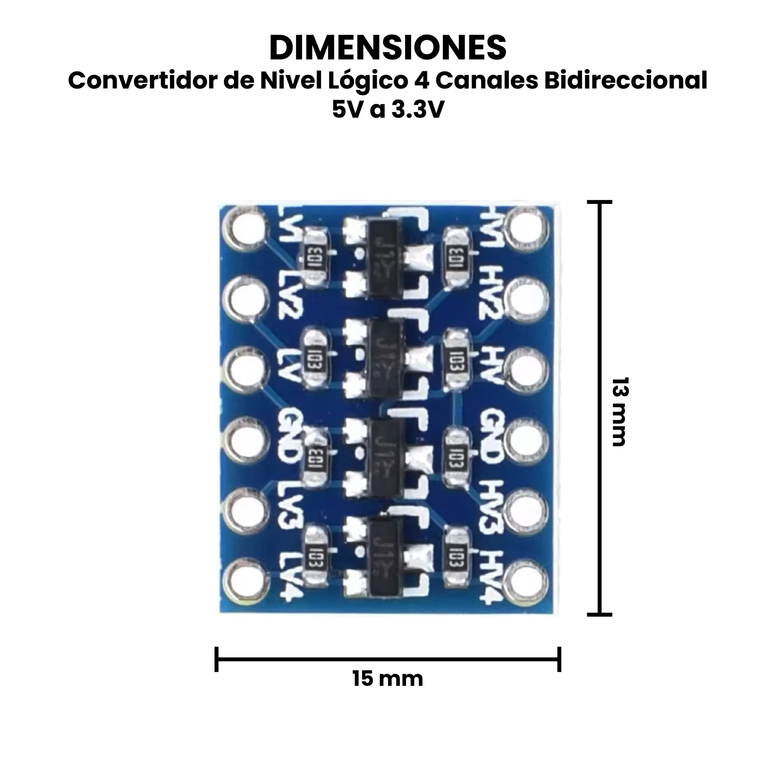 El Convertidor de Nivel Lógico de 4 Canales Bidireccional 5V a 3.3V es un módulo electrónico diseñado para adaptar señales digitales entre dispositivos que trabajan con diferentes voltajes, permitiendo la comunicación segura entre sistemas de 5 V y 3.3 V. Cada uno de sus cuatro canales independientes puede convertir señales simultáneamente, reduciendo el voltaje cuando la señal va de 5 V a 3.3 V y elevándolo cuando viaja en sentido contrario.